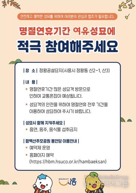 시민행정신문 강갑수 기자 | 시흥시는 우리 민족 고유의 명절인 설을 맞아 성묘객 밀집에 따른 안전사고를 예방하고 시민 편의 증진을 위해 명절 연휴 전후 여유 성묘 캠페인을 추진하고 있다.