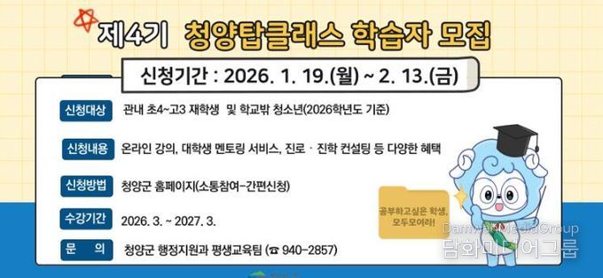 시민행정신문 강갑수 기자 | 청양군이 지역 학생들에게 수도권 수준의 고품격 교육 콘텐츠를 제공해 도농간 교육 격차를 줄이고 인재 유출을 막기 위한 ‘제4기 청양 탑클래스 학습지원’ 사업을 본격 추진한다.