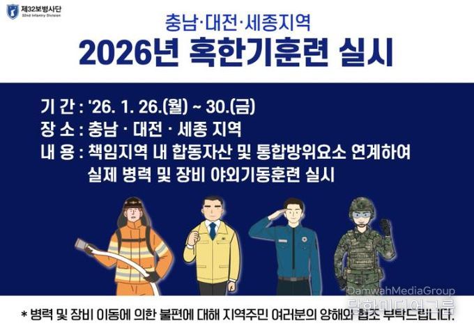 시민행정신문 강갑수 기자 | 육군 제32보병사단은 오는 1월 26일부터 30일까지 충남ㆍ대전ㆍ세종 지역에서 동계 통합 방위 작전 확립을 위한 혹한기 훈련을 진행한다.