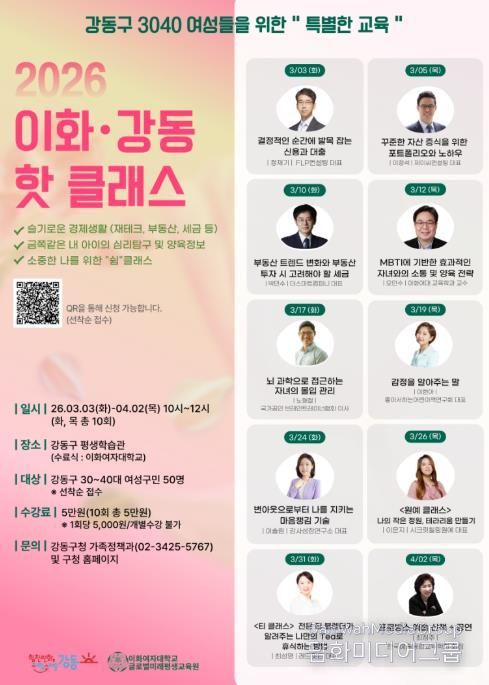 시민행정신문 강갑수 기자 | 서울 강동구는 강동의 대표적인 여성 평생교육 프로그램인 '이화-강동 핫 클래스' 제2기 수강생을 1월 19일부터 선착순 모집 중이라고 밝혔다.