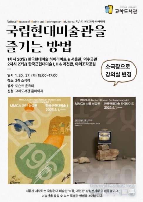 시민행정신문 강갑수 기자 | 파주시 교하도서관은 오는 20일과 27일, 15시부터 17시까지 교하도서관 3층 소극장에서 전문 안내원(도슨트) 초청 강연 프로그램 ‘국립현대미술관을 즐기는 방법’을 운영한다.