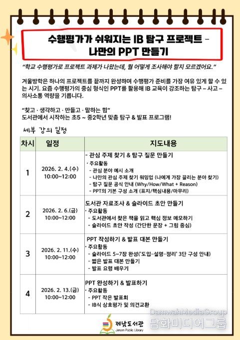 제남도서관 관계자는 “이번 프로그램을 통해 학생들이 스스로 주제를 정하고 탐구하는 경험을 쌓음으로써 자기주도적 학습 역량을 기르고 학교 수행평가와 발표 수업에 대한 자신감을 높이는 계기가 되길 바란다”고 말했다.
