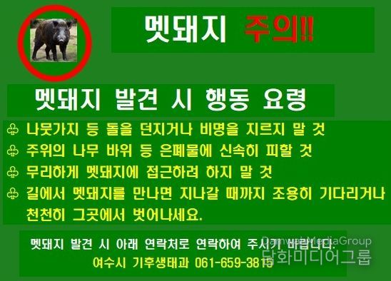 여수시는 멧돼지 피해 예방을 위해 유해야생동물 피해방지단을 선발 및 운영하고 있으며 출몰 우려 지역을 중심으로 피해방지단의 순찰을 강화하고 있다.