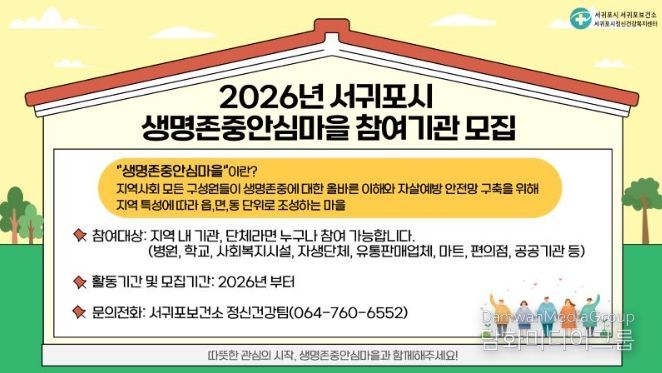 시민행정신문 기자 | 서귀포시는 2026년 두터운 생명존중사업의 일환으로 생명존중안심마을을 기존 3개소에서 6개소까지 확대 운영한다고 밝혔다.