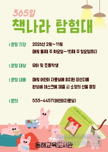안은희 관장은 “‘365일 책나라 탐험대’를 통해 어린이들이 도서관 방문을 즐겁게 느끼고, 다양한 독서 경험을 쌓아 평생 독자로 성장하는 계기가 되기를 바란다”고 말했다.