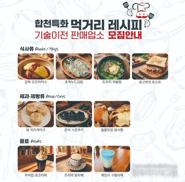 모집 대상은 합천군 내에 영업 신고가 된 일반음식점, 제과점, 휴게음식점 등이며, 기술이전을 통해 창업을 준비 중인 예비 창업자도 신청 가능하다.