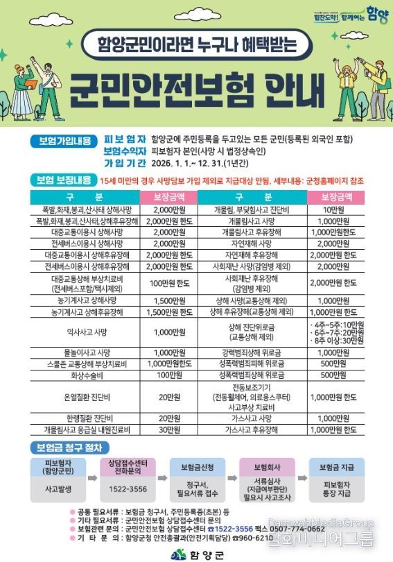 보험 기간은 2026년 1월 1일부터 12월 31일까지이며, 함양군에 주민등록을 둔 모든 군민은 별도의 절차 없이 자동으로 가입된다. 등록 외국인도 동일하게 혜택을 받을 수 있으며, 다른 지역으로 전출할 경우 자동으로 보험이 해지된다. 전입자의 경우 전입일로부터 보험 혜택이 적용된다.