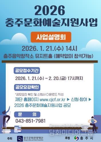 시민행정신문 강갑수 기자 | (재)충주문화관광재단은 충주시 예술인 및 예술단체의 창작활동 기반을 마련하여 문화예술 생태계를 조성하고자 1월 19일부터‘2026 충주문화예술지원사업’공모를 진행하고 있다고 밝혔다.
