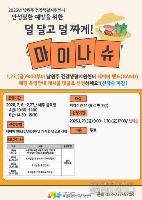 시민행정신문 강갑수 기자 | 남원주건강생활지원센터는 지역 주민의 만성질환 예방과 관리를 위해 ‘덜 달고 덜짜게! 마이나슈 요리교실’ 프로그램 참여자를 모집한다.