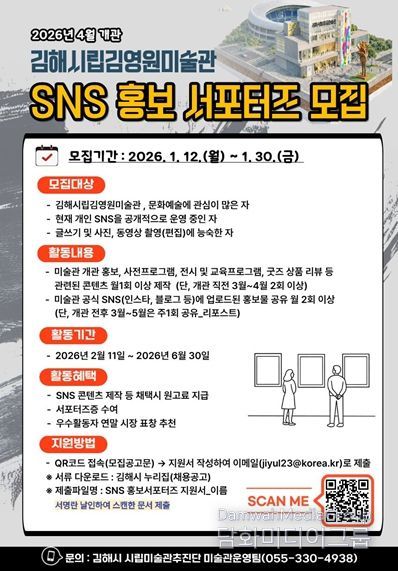 시민행정신문 강갑수 기자 | 김해시는 오는 2026년 4월 개관 예정인 ‘김해시립김영원미술관’을 알리고, 미술관의 개관 과정을 생생하게 기록하고 홍보할 'SNS 홍보 서포터즈'를 모집한다고 밝혔다.