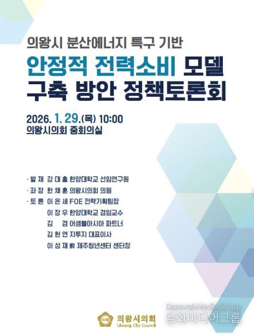 시민행정신문 기자 | 의왕시의회는 오는 29일 오전 10시, 시의회 중회의실에서 '의왕 분산에너지 특구 기반 안정적 전력소비 모델 구축 방안 정책토론회'를 개최한다고 밝혔다.