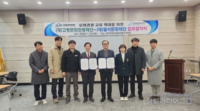 시민행정신문 강갑수 기자 | (재)고령문화관광재단(대표이사 이승익)과 (재)달서문화재단(대표이사 박병구)은 지난 1월20일 고령군에 소재한 대가야역사테마관광지 인빈관에서 두 기관 관계자들이 참석한 가운데 상호협력 확대를 위한 업무협약을 체결했다. 이번 협약을 통해 경북 고령군과 대구 달서구는 문화관광분야 교류 확대에 힘을 모으기로 했다.