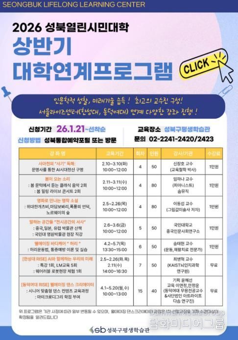 시민행정신문 강갑수 기자 | 서울 성북구가 2월부터 5월까지 구민을 대상으로 ‘2026 상반기 열린시민대학’을 운영한다.