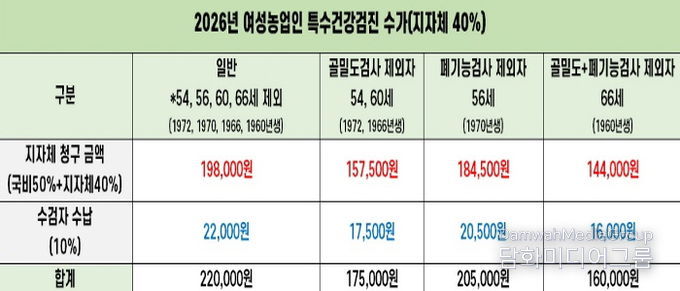 검진 항목은 근골격계‧심혈관계 질환, 농약중독 검사 등 여성농어업인에게 취약한 질환 중심으로 구성된다. 건강 상태에 따라 질환 예방을 위한 상담도 함께 제공한다.