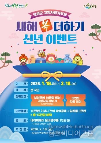 시민행정신문 강갑수 기자 | 보성군은 2026년 새해를 맞아 고향사랑기부제 참여를 확대하고 기부 문화를 활성화하기 위해 오는 2월 18일까지 ‘새해 복 더하기 신년 이벤트’를 추진한다고 밝혔다.