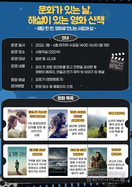 시민행정신문 기자 | 대구시교육청 산하 대구남부도서관은 지역주민들이 영화를 보다 깊이 이해하고 풍부하게 감상할 수 있도록 2026년 상반기 '문화가 있는 날, 해설이 있는 영화산책' 프로그램을 운영한다.