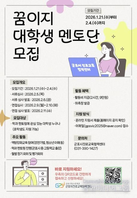 시민행정신문 강갑수 기자 | (재)군포시청소년재단 군포시진로교육협력센터는 관내 청소년의 진로 탐색과 진로 역량 강화를 위해 '2026년 군포시진로교육협력센터 교육기부자'를 모집한다고 밝혔다.