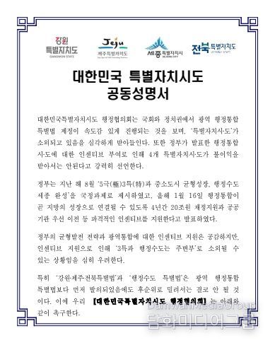 세종특별자치시와 제주특별자치도, 강원·전북특별자치도로 구성된 ‘대한민국특별자치시도 행정협의회’는 22일 이같은 내용을 담은 4개 시도지사 명의의 공동성명서를 발표했다.