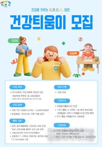 시민행정신문 기자 | 이천시는 2026년 초등학생, 어린이집 및 유치원 건강교육 프로그램인 ‘건강틔움’ 운영을 위한 아동 건강서포터즈를 1월 21일부터 2월 4일까지 모집한다고 밝혔다.