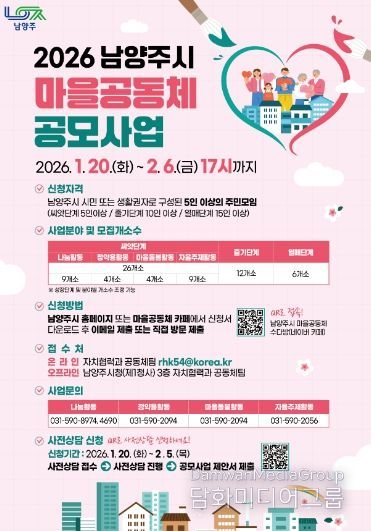 시민행정신문 강갑수 기자 | 남양주시는 1월 20일부터 2월 6일까지 ‘2026년 마을공동체 공모사업’참여 공동체를 공개 모집한다.