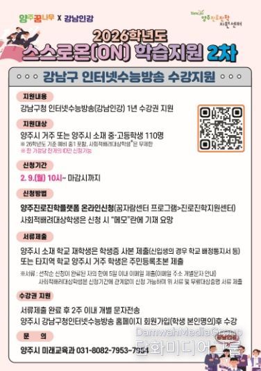 이번 수강권 지원을 통해 양주시 청소년들은 지역이나 가정 여건에 관계없이 검증된 공공 학습 콘텐츠를 활용해 겨울방학 기간에도 안정적인 학습을 이어갈 수 있게 됐다. 특히 시간과 장소의 제약 없이 학습이 가능해 학교 수업과 병행한 효율적인 자기주도학습이 가능할 것으로 기대된다.