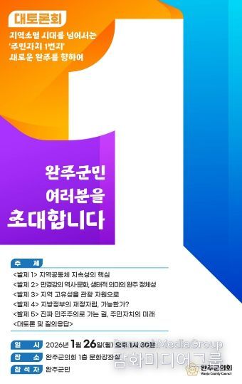 토론회에는 완주군의회 의원을 비롯해 완주군민, 완주군 공무원 등 70여 명이 참석할 예정이며, 주제 발표와 토론, 질의응답이 결합된 참여형 토론 방식으로 진행된다.
