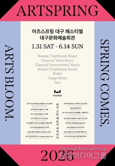 시민행정신문 강갑수 기자 | 대구문화예술회관은 대구를 기반으로 활동하는 지역 예술인들의 공연을 한데 모아 그들의 예술혼을 집중 조명하는 축제 '2026 아츠스프링 대구 페스티벌'의 16개 공연을 오는 1월 31일부터 6월 14일까지 대구문화예술회관에서 개최한다고 밝혔다.