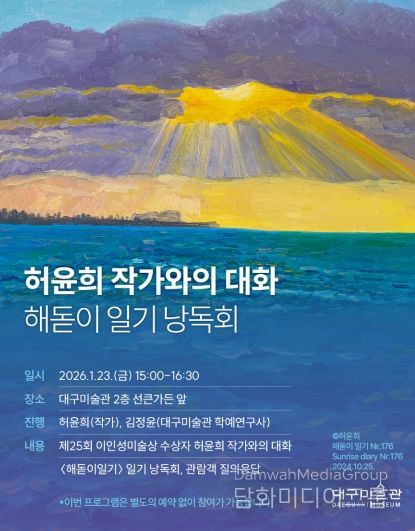 시민행정신문 강갑수 기자 | 대구문화예술진흥원 대구미술관은 제25회 이인성미술상 수상자전 ‘허윤희: 가득찬 빔’의 전시 연계 프로그램으로 ‘허윤희 작가와의 대화: 해돋이 일기 낭독회’를 1월 23일 오후 3시, 대구미술관 2층 선큰가든에서 개최한다.