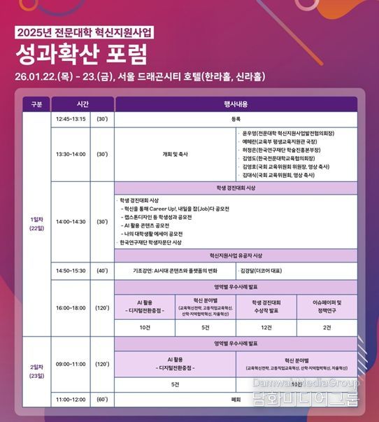 시민행정신문 김학영 기자 | 교육부와 한국연구재단(이사장 홍원화)은 1월 22일부터 23일까지 드래곤시티 호텔(서울)에서 ‘2025 전문대학 혁신지원사업 성과 확산 공유회’를 개최한다.