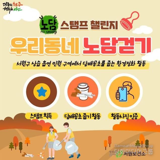 시민행정신문 기자 | 청주시 서원보건소는 매주 토요일과 일요일에 깨끗한 금연환경 조성을 위한 비대면 자원봉사 프로그램 ‘우리 동네 노담걷기’를 연중 운영한다고 22일 밝혔다.