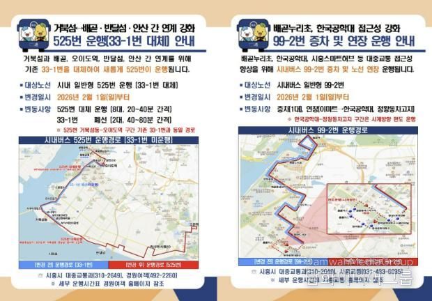 아울러 2월 1일에는 배곧과 정왕동 일원의 접근성 강화를 위해 시내버스 일반형 99-2번 노선도 증차ㆍ연장 운행된다. 99-2번은 차량 1대를 늘리고, 기존 이마트에서 한국공학대와 정왕동 차고지까지 운행 구간을 확대해 배곧 누리초등학교 일원 주거지역과 대학, 산업단지 간 이동 여건 개선에 이바지할 것으로 보인다. 시는 운송개시에 앞서 시민 혼선을 최소화하기 위해 사전 홍보를 진행하고, 이후에도 실제 이용 여건과 운행 상황을 면밀하게 살필 계획이다.