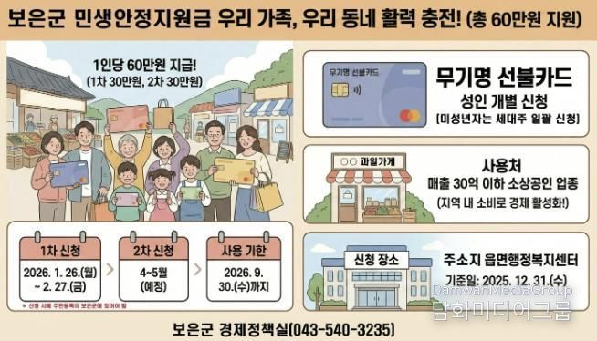 지원 대상은 2025년 12월 31일부터 신청일까지 계속해 보은군에 주민등록상 주소를 두고 있는 군민으로, 결혼이민자와 영주권자도 포함된다. 지원금은 1인당 총 60만 원(1차 30만 원, 2차 30만 원)을 무기명 선불카드로 지급한다.