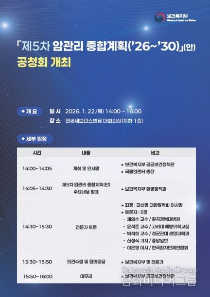 시민행정신문 이존영 기자 | 보건복지부는 1월 22일 오후 2시 연세세브란스빌딩 (서울특별시 중구 소재)에서 '제5차 암관리 종합계획(’26∼’30)'(안)에 대한 공청회를 개최한다고 밝혔다.