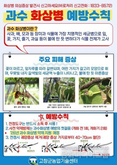 또한 농가에서는 과수의 꽃, 잎, 가지 등에 이상 증상이 나타날 경우 자체 판단으로 제거하지 말고 즉시 고창군 농업기술센터에 신고해 정밀 진단을 받아야 한다. 조기 신고는 확산 방지와 피해 최소화에 결정적인 역할을 한다.
