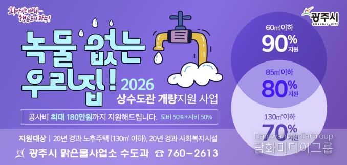시민행정신문 강갑수 기자 | 광주시는 깨끗하고 안전한 수돗물 공급을 위해 ‘녹물 없는 우리 집 수도관 개량 지원사업’을 추진한다고 23일 밝혔다.