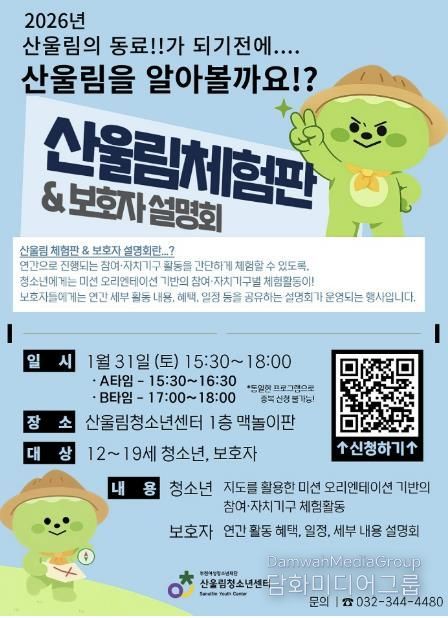 시민행정신문 강갑수 기자 | 부천여성청소년재단이 운영하는 산울림청소년센터는 오는 1월 31일, 2026년도 참여·자치기구 활동에 관심 있는 청소년과 보호자를 대상으로 ‘산울림 체험판 & 보호자 설명회’를 개최한다.