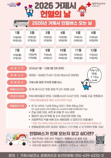 시민행정신문 기자 | 거제시는 헌혈의 중요성을 알리고 생명 나눔 문화 확산을 위해 2026년'헌혈의 날'을 매달 13일과 말일에 운영한다.