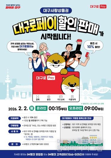시민행정신문 이세훈 기자 | 대구광역시는 고물가로 위축된 시민들의 소비 부담을 덜고, 지역 골목상권에 활력을 불어넣기 위해 오는 2월 2일부터 대구사랑상품권 ‘대구로페이’ 판매를 시작한다.
