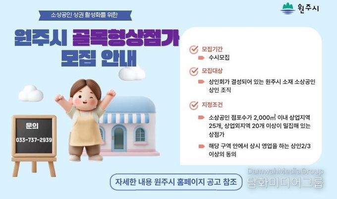 시민행정신문 강갑수 기자 | 원주시는 소상공인 상권 활성화를 위해 1월 26일부터 ‘원주시 골목형상점가’ 지정을 희망하는 상인 조직을 모집한다.