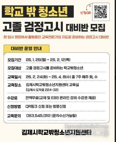 시민행정신문 강갑수 기자 | 김제시는 학교밖청소년지원센터(꿈드림)가 학교 밖 청소년의 학력 취득을 지원하기 위해 2026년 고졸 검정고시 대비반을 운영한다고 밝혔다.