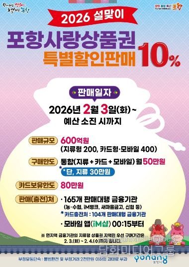 이번 특별할인분은 지류형 200억 원, 카드형·모바일(이하 포항사랑카드) 400억 원 등 총 600억 원으로, 예산 소진 시 조기 종료된다.