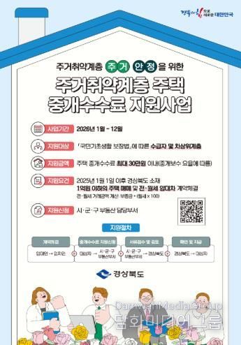 이 사업은 ‘경상북도 주택의 중개보수 등에 관한 조례’ 일부 개정에 따라 2025년 1월 1일 이후 거래분부터 소급 적용되며, 지원조건은 경북도 내 1억원 이하의 주택 매매 또는 임대차 계약을 체결하고 전입신고를 완료한 주거취약계층을 대상으로 중개 수수료를 지원한다.