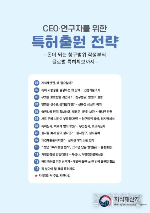 시민행정신문 강갑수 기자 | 지식재산처는 특허출원을 준비하는 기업 CEO 및 연구자들이 꼭 알아야 할 핵심 전략을 담은 'CEO·연구자를 위한 특허출원 전략'을 발간·배포했다고 25일 밝혔다.
