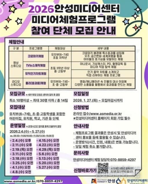 시민행정신문 강갑수 기자 | 안성미디어센터는 지역 어린이와 청소년이 미디어를 쉽고 재미있게 접할 수 있도록 ‘2026년 미디어체험프로그램’에 참여할 관내 어린이집, 유치원, 학교 등 단체를 모집한다고 밝혔다.