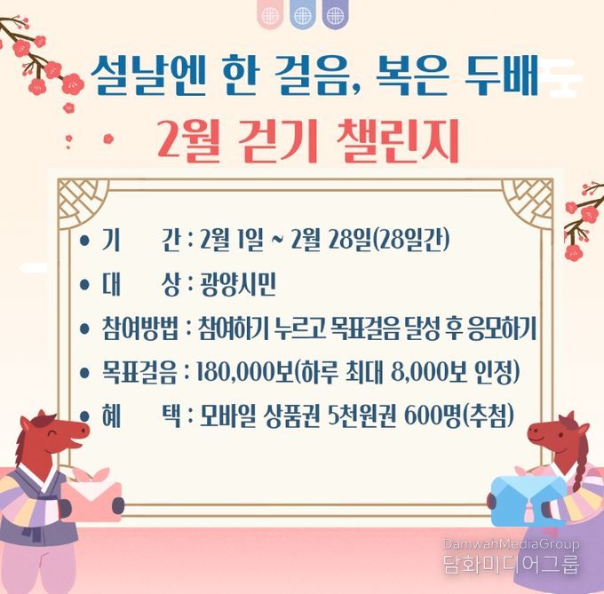 시민행정신문 강갑수 기자 | 광양시는 시민의 건강 증진과 걷기 실천 확산을 위해 오는 2월 1일부터 2월 28일까지 건강걷기 실천 모바일 걷기 앱 ‘워크온’을 활용한 ‘설날엔 한 걸음, 복은 두배! 2월 걷기 챌린지’를 운영한다고 밝혔다.