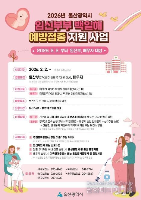 시민행정신문 기자 | 울산 중구보건소가 오는 2월 2일부터 임산부와 배우자를 대상으로 백일해 무료 예방접종을 실시한다.