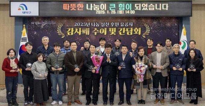 대덕구는 26일 구청 대회의실에서 2025년 어려운 이웃돕기에 적극 참여한 나눔 실천 유공자들을 대상으로 감사패 수여식과 간담회를 개최했다.