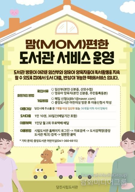 시민행정신문 강갑수 기자 | 당진시는 도서관 방문이 어려운 시민들을 위해 당진시립도서관에서 ‘맘(MOM)편한 도서관 서비스’와 ‘어르신 도서 대출 택배 서비스’를 운영하고 있다고 27일 밝혔다.