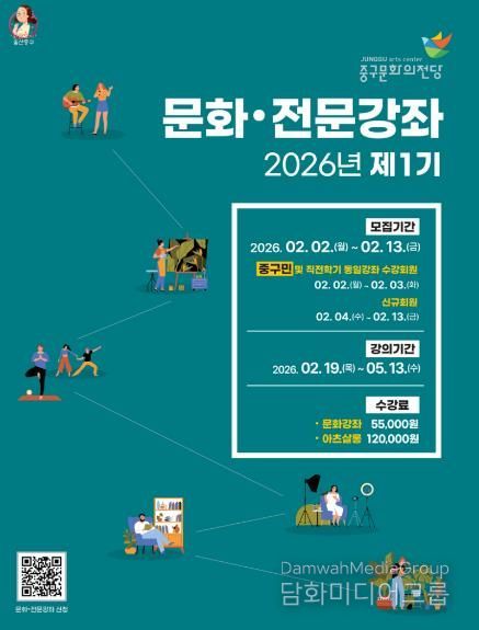 중구문화의전당 관계자는 “주민들의 삶의 질 향상을 위해 다양한 문화 예술 강좌를 지속적으로 발굴해 운영하겠다”며 “주민들의 많은 관심과 참여를 기다린다”고 밝혔다.