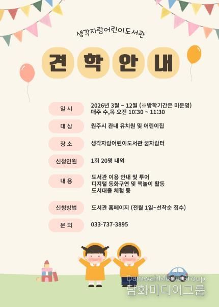 시민행정신문 강갑수 기자 | 원주시 생각자람어린이도서관은 오는 3월부터 12월까지 관내 유치원과 어린이집 원아를 대상으로 견학 프로그램을 운영한다.